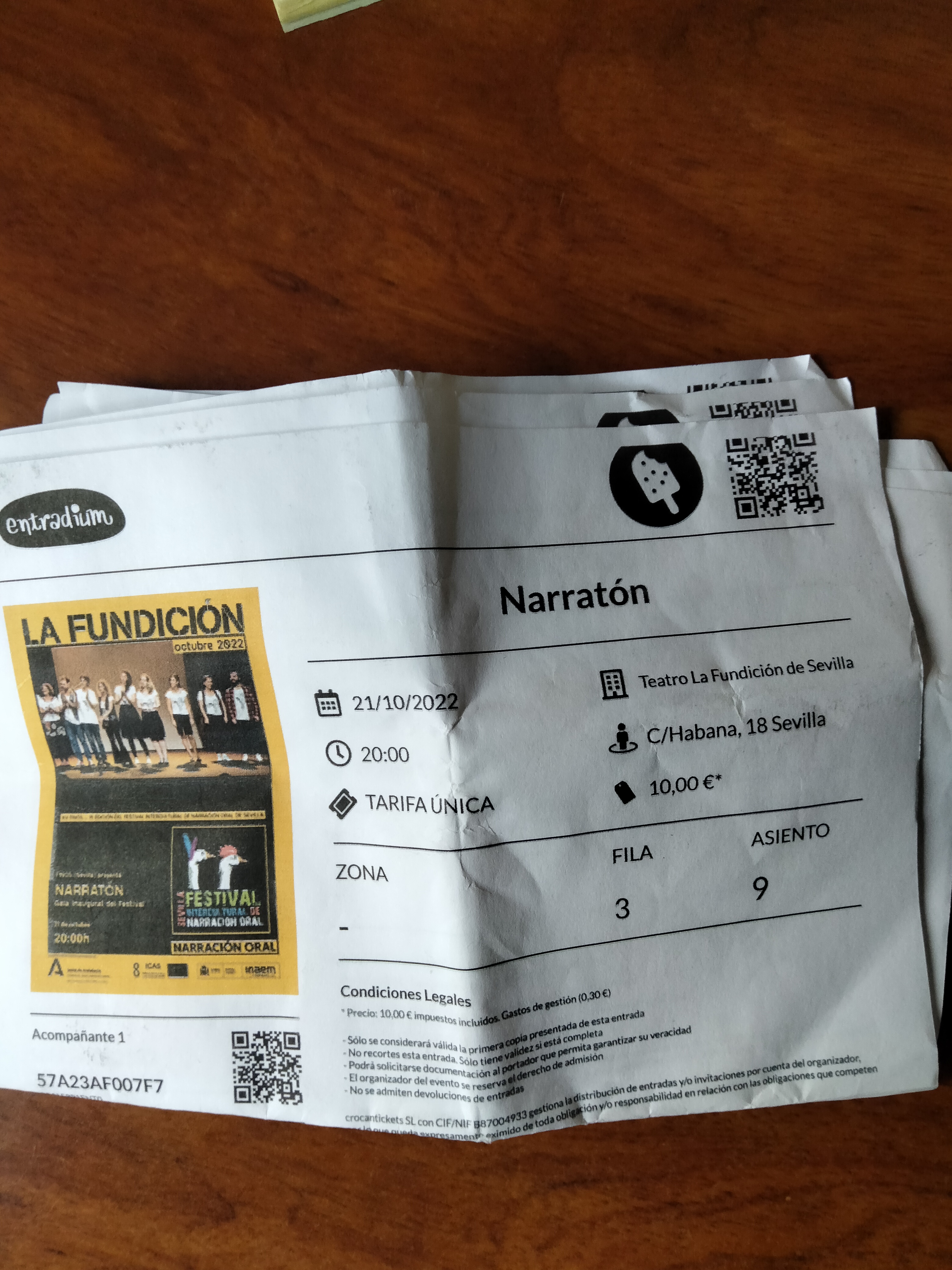 Cogí el paraguas, cerré con llaves y al meterlas en el bolsillo, allí estaban, las entradas del FINOS (Festival de Narración oral de Sevilla) del año pasado. Ahora comprenderéis eso de acumular que os explicaba antes.